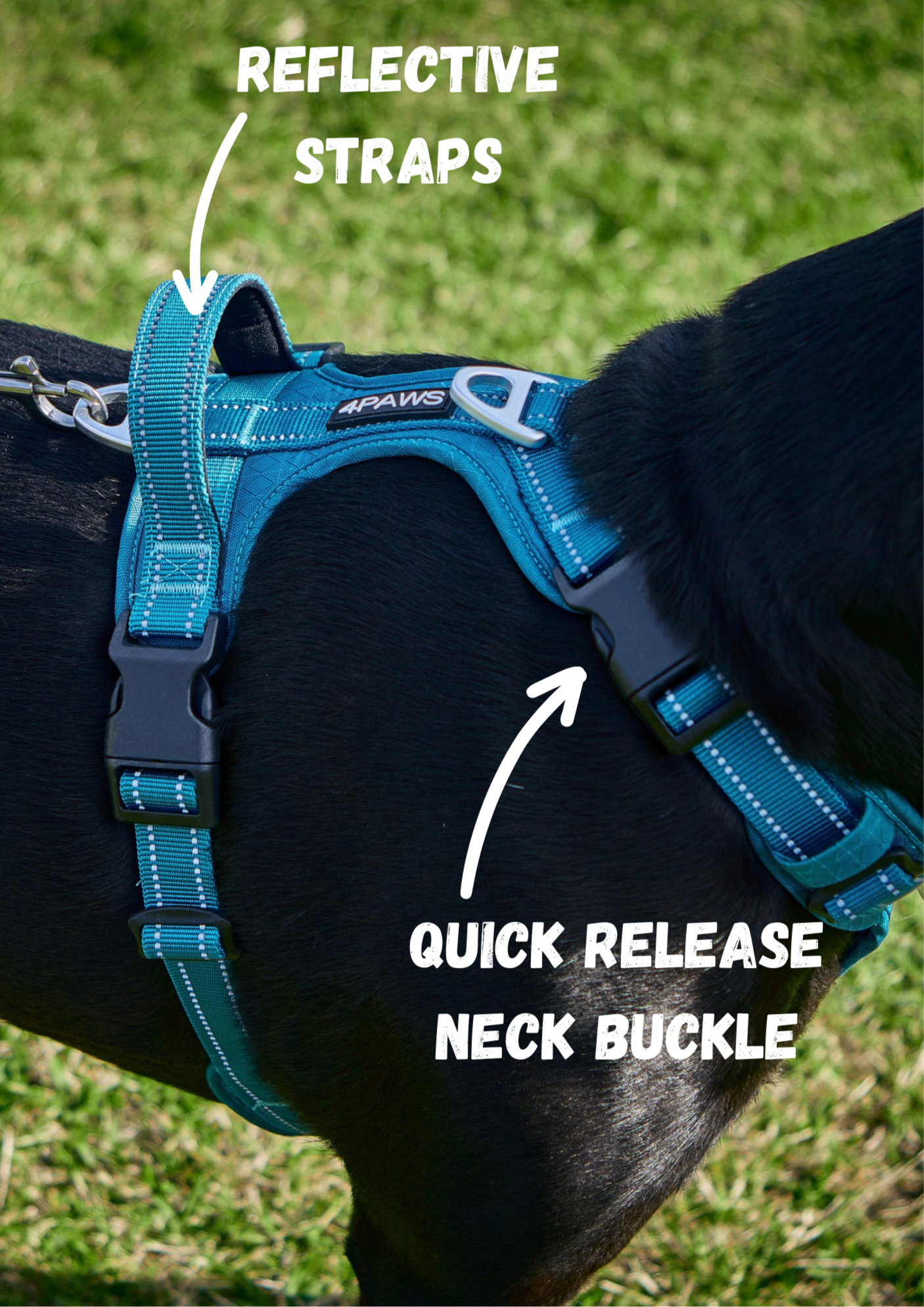 An extra neck buckle means no more struggling to get the harness over your dog’s head—especially great for dogs with large heads or who don’t like tight spaces.